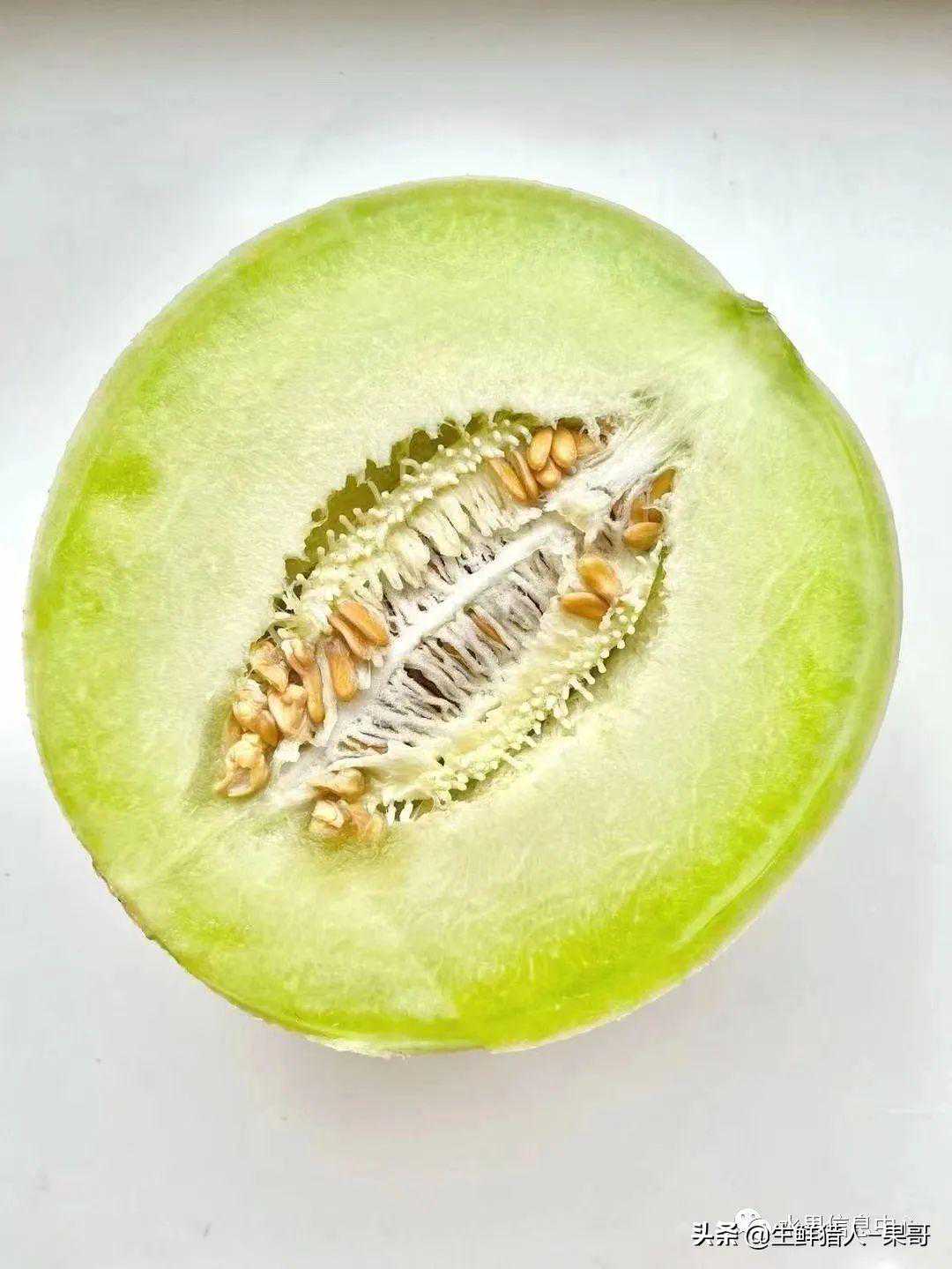 新芳露:果品为浅浅黄绿色上覆盖着均匀的网眼,网眼不立体,果肉乳白色,甜度高。