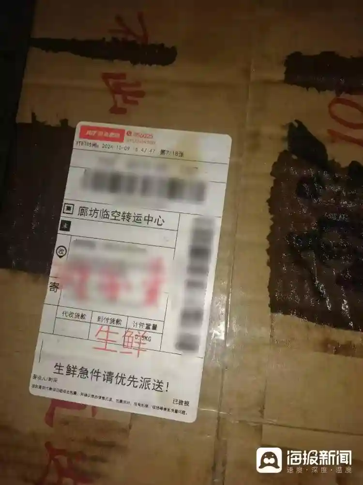 徐燕提供了多张上述快递的照片,记者看到,2个快递箱多处均已被浸湿。从其张贴的快递邮寄单据上,可看到明显标有“生鲜”“生鲜急件请优先派送”的提示。