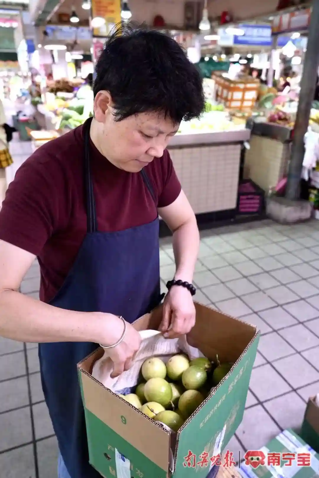 “南宁的黄金百香果,甜得很。”在淡村市场,摊贩老板农女士一边忙碌打包发货,一边热情招呼市民来品尝选购。农女士表示,进入夏季,广西大量水果缤纷上市,不仅南宁本地的消费者实现了“水果自由”,也吸引了全国各地的“果迷”们纷纷下单。“蓝莓、火龙果……南宁的水果真是太多了,很多都是我没见过的,100元钱可以买一大堆!我每样都买一些寄回老家给亲戚尝尝。”来自黑龙江的游客周先生听说南宁水果物美价廉,特地到农贸市场转转,一进市场便被诸多水果种类给惊喜到了。