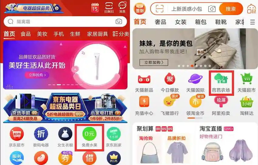 每家偏向的目标不同,很明显淘宝主要是为了让用户多下单,所以获得肥料的任务都是浏览商品和购买商品之类的;至于京东更偏向于推广自家其他产品APP,京东金融一直是东东果园的首要推荐。