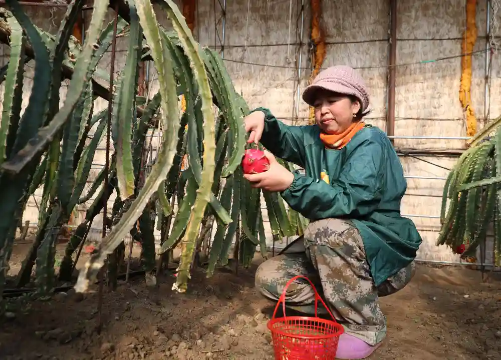 在辽宁省辽阳市辽阳县下达河乡大牛岭村,农民在大棚内收获火龙果。新华社记者杨青摄