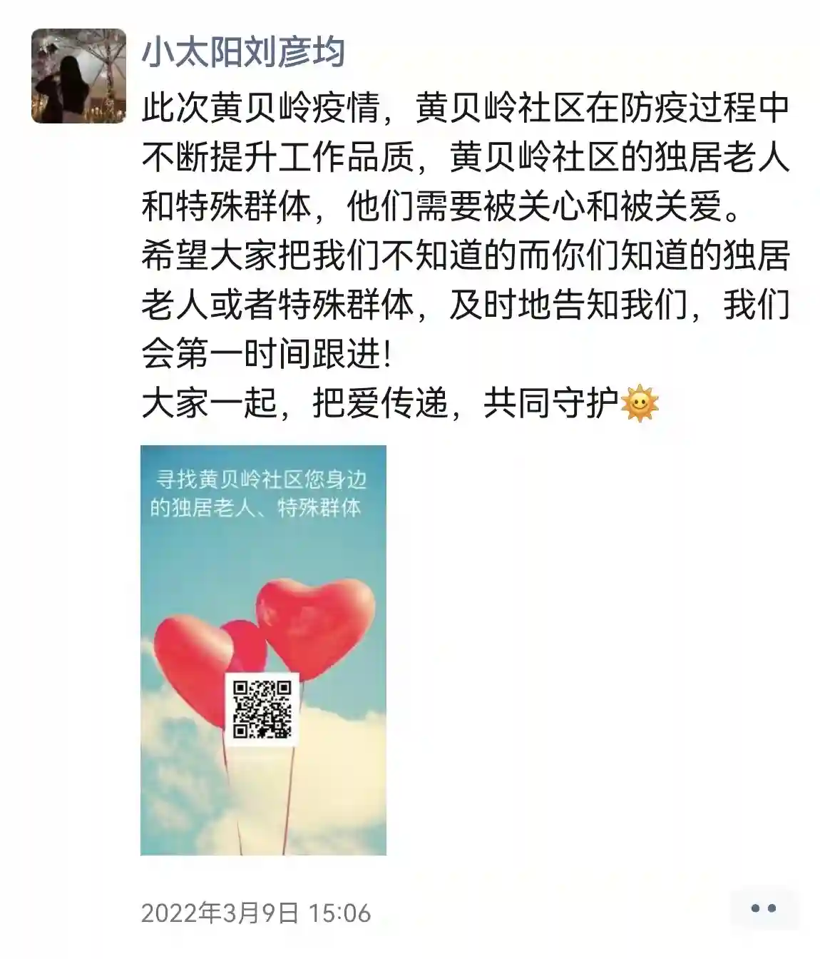 疫情之前,通过网格员上门等方式摸排,社区登记了大约10多名独居老人。疫情期间,通过一轮一轮的扫楼,制作“寻找黄贝岭社区您身边的独居老人、特殊群体”问卷星调查表等方式,更多的独居老人、特殊群体被发现。“我们会把他们都纳入关爱名册,主动帮助他们解决生活需要。”刘彦均说。