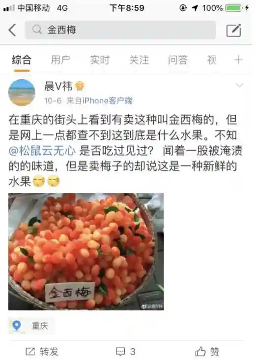 “这种金西梅,25元一斤,小贩说是树上长出来就这样子。一口下去,梅酸味原来是后天染色泡制的。”“金西梅,看起来梦幻得不真实的水果,作为颜控就没法忍住买了,十块钱就几颗,甜死了,后来发现是腌制过的……”