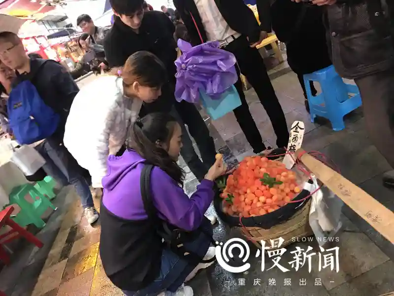 10月14日,上游新闻·重庆晚报记者来到渝中区解放碑好吃街附近发现,确实有挑着扁担的流动商贩在叫卖着一种叫金西梅的水果,25元一斤,连续走访了四五个商贩都声称从树上摘下来就是这样子,绝对是新鲜水果。