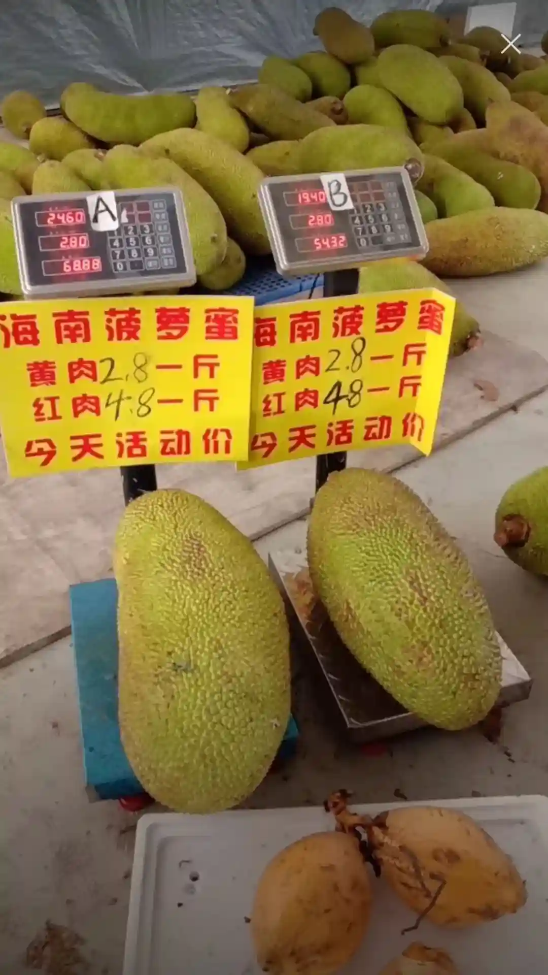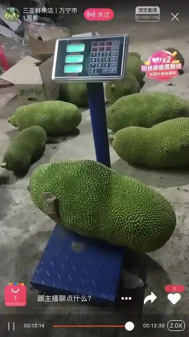 很快就有网友留言:挑个八分熟的,一旁的快递小哥熟练选出一个菠萝蜜搬上秤,显示屏上跳出红色的数字,重量、价格一目了然。
