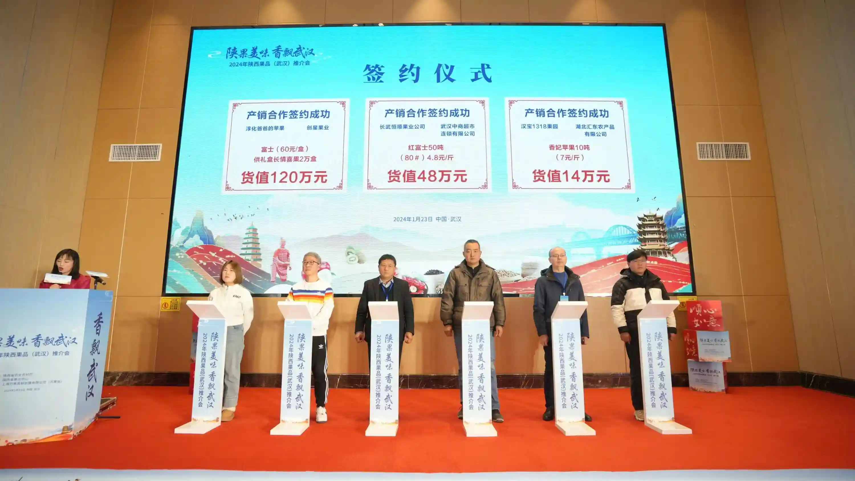 1月22日-23日,由陕西省农业农村厅指导,陕西省果业中心主办,主题为“陕果美味香飘武汉”的2024年陕西果品(武汉)宣传推介活动在湖北省武汉市举办。活动组织宝鸡、咸阳、渭南3市15县区的22家果品开展了系列产销对接和宣传推介活动,拓展苹果、猕猴桃、酥梨、柿饼等陕西特色果品在武汉和华中地区的消费市场。