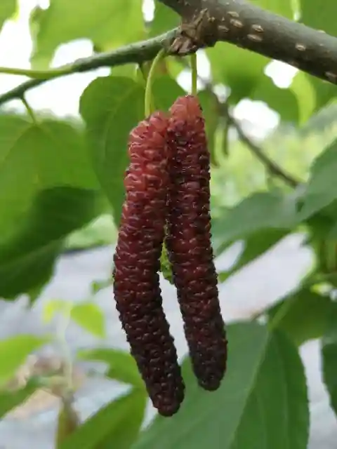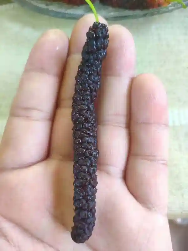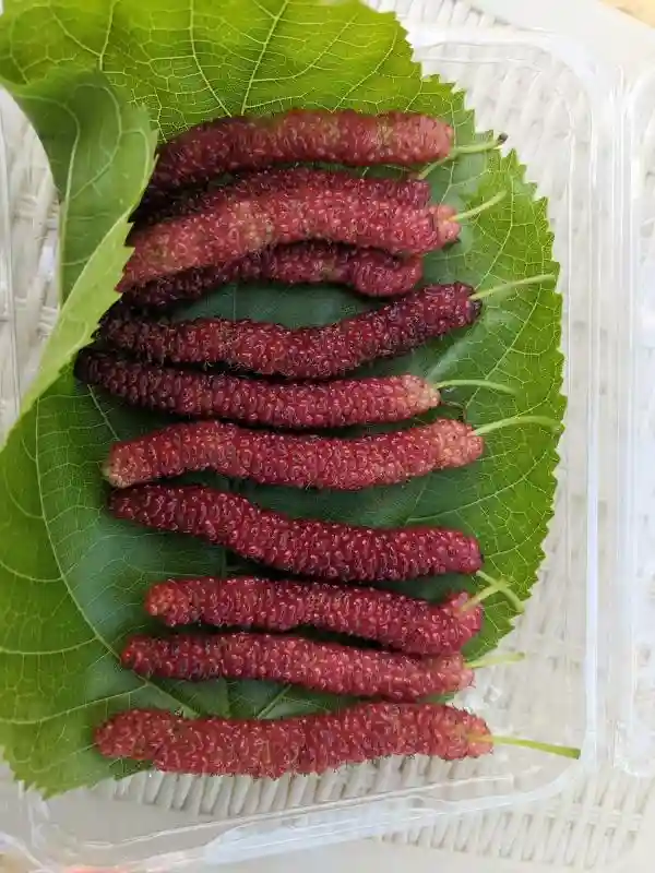 这种水果名叫四季果桑,又名长果桑,是原产自我国台湾地区的珍稀桑果品种,在气候温暖的广东、广西和海南等地都有种植。相比市面上普通的短小圆润的桑葚,长果桑名副其实,有着细长的外形,一般果长约8厘米至12厘米,熟果呈紫红色,非常诱人。