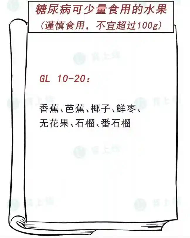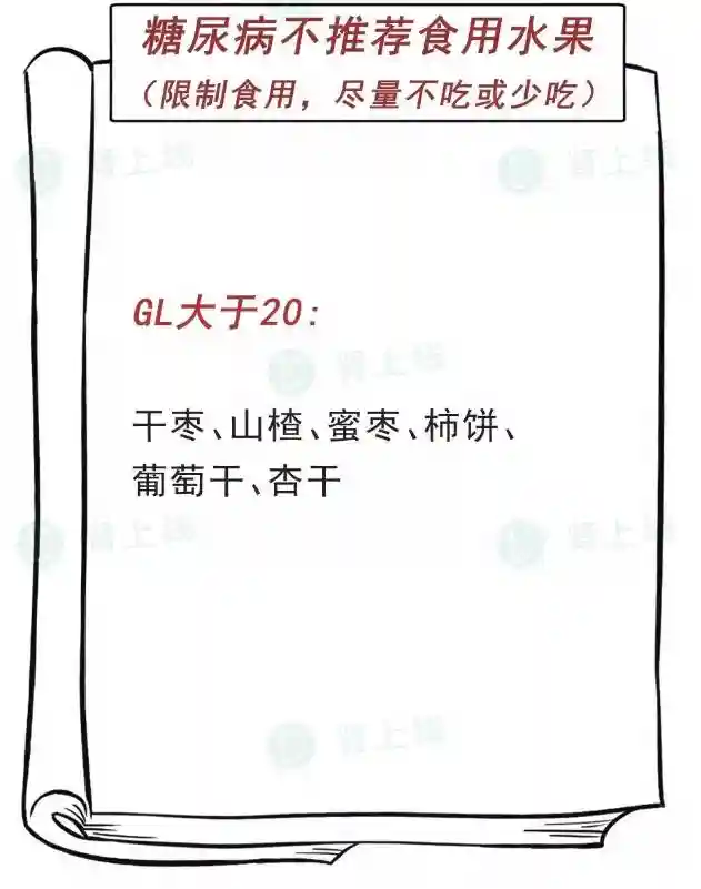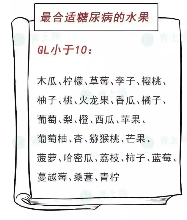 建议糖尿病患者优先选择GL值小于10的水果,每日200-300g是可以的。GL=GI×可用碳水化合物/给定食物量,GL值不仅考虑了食物的升糖能力(GI)且同时考虑了糖的实际摄入量,因此GL值相比GI值能更全面的判断食物对血糖的影响。