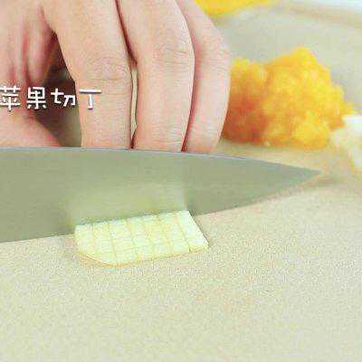 5、将苹果丁、橙子丁、雪梨丁倒入奶锅中。