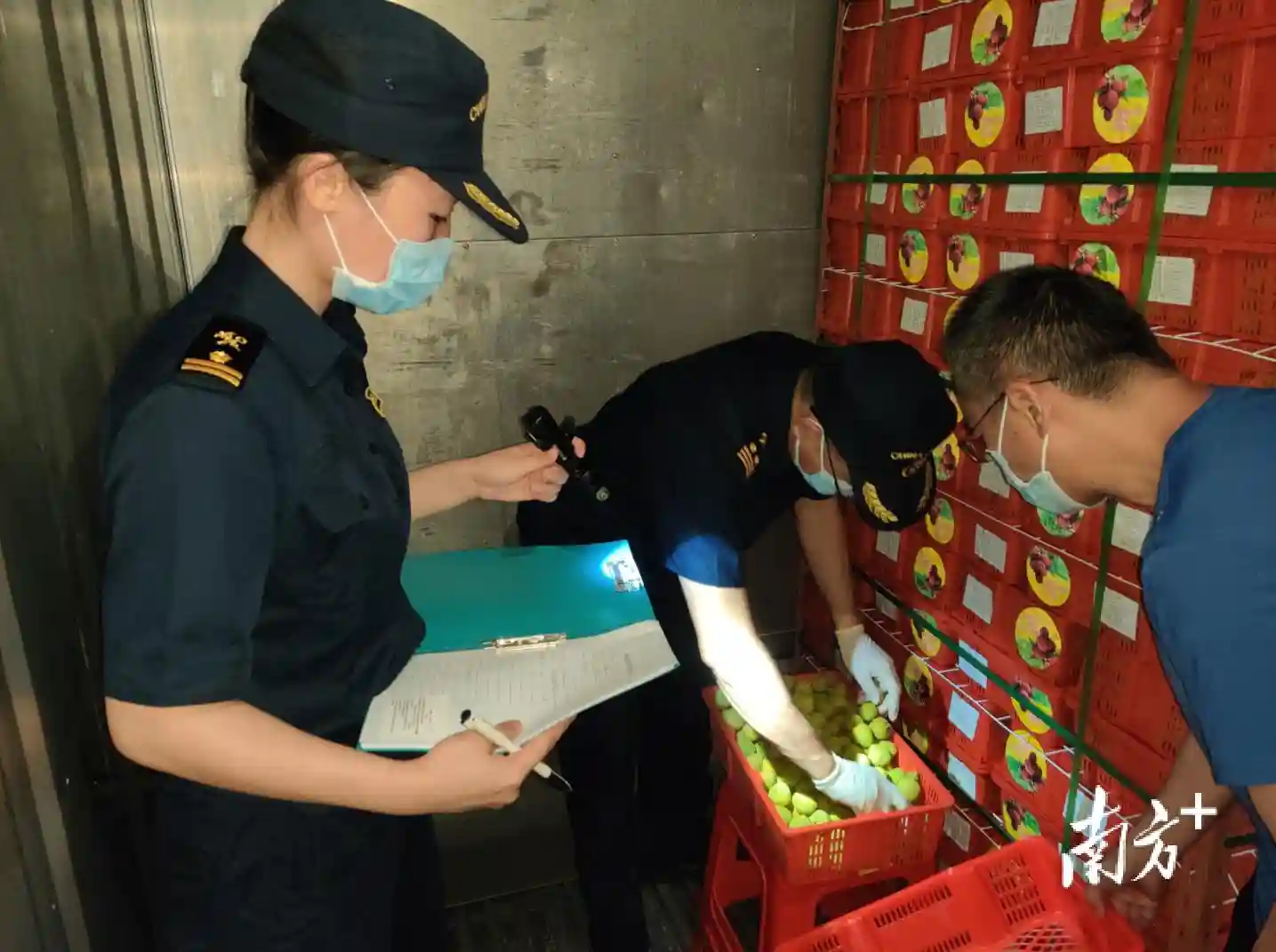 茂名海关关员现场监管出口荔枝。