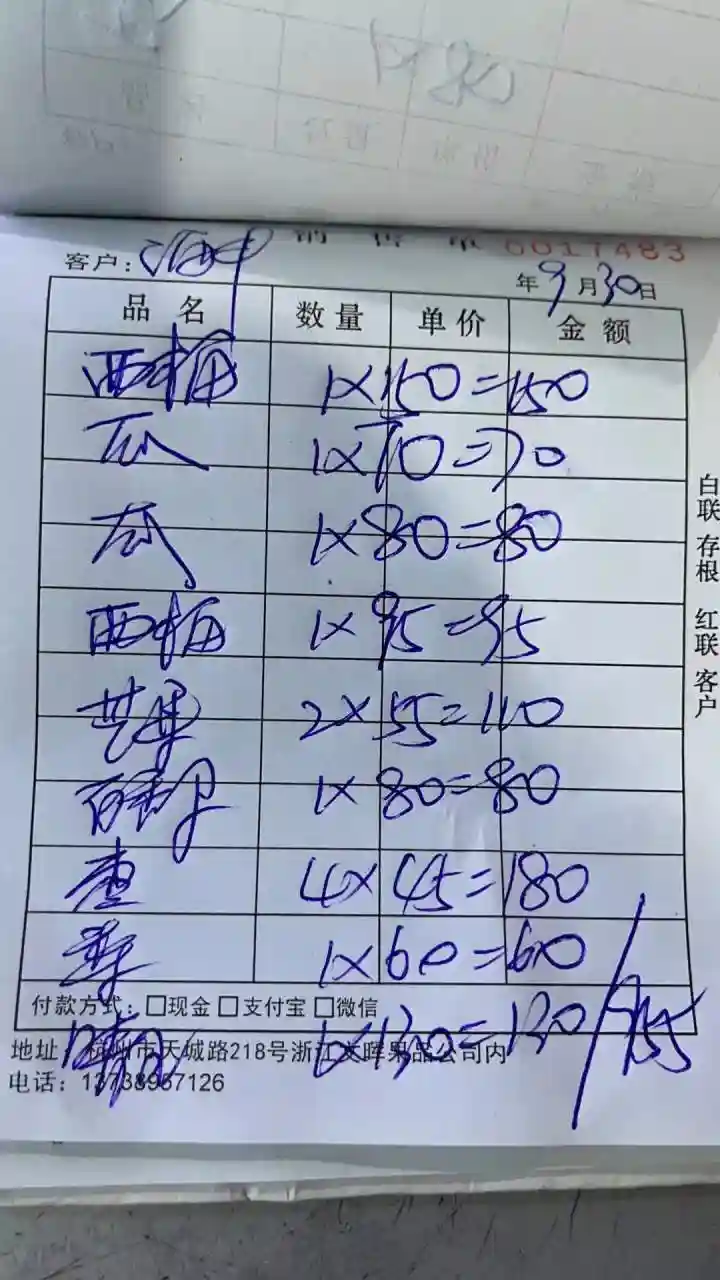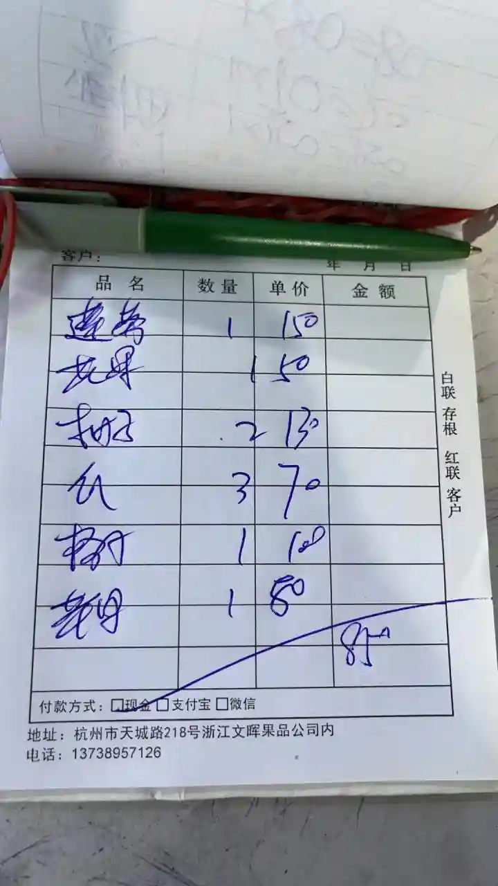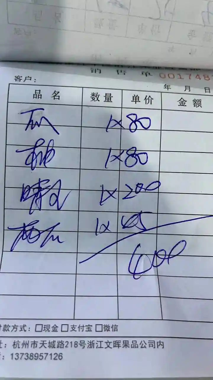 有位女顾客让伙计装了两千多元的水果,车子后备箱塞得满满当当,写满了三张提货单。