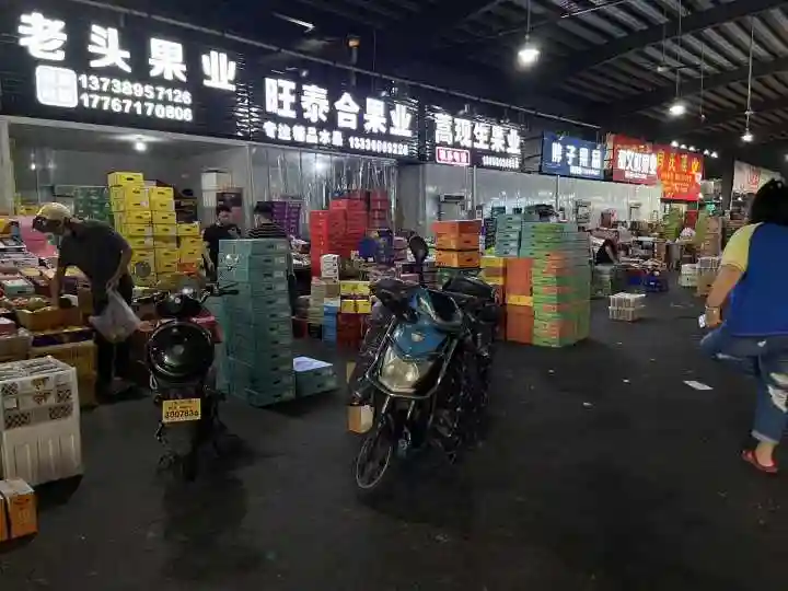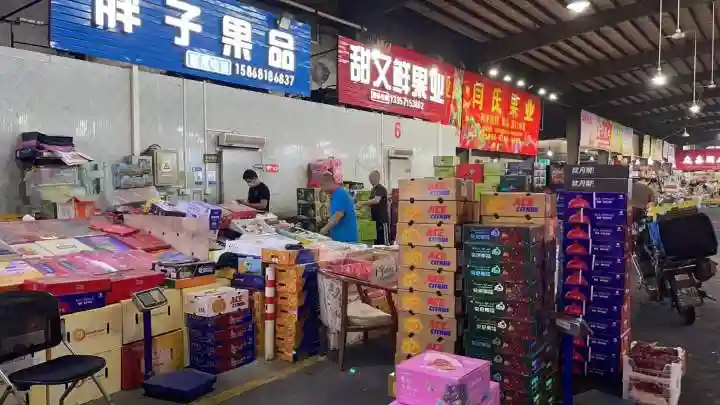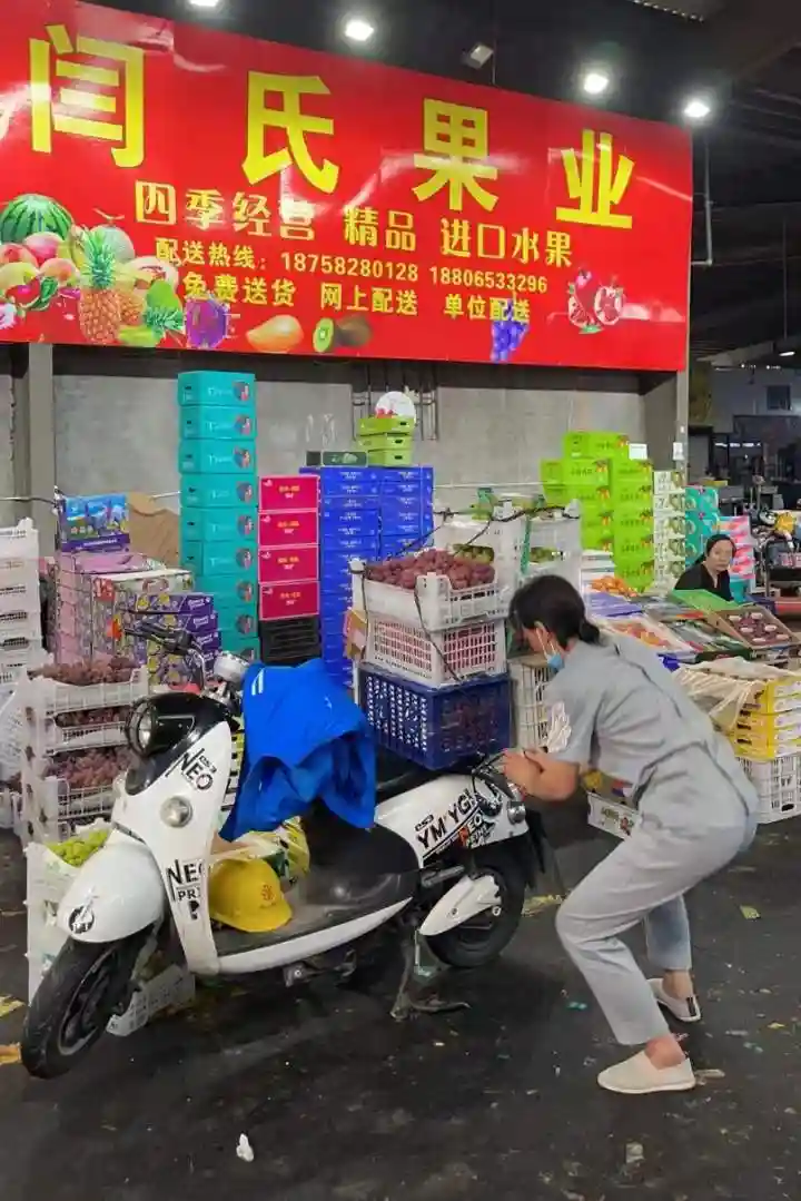 文晖大桥下的天成路218号,水果批发市场和农贸市场这两大市场热热闹闹。一进门就看到私家车一辆一辆地有序进出,市场里虽然有些空旷,但是走近一看,几乎家家户户的摊位前都有电动车停着,那是来取货的骑手——早晨5点多,批发业务就开始了,到上午八九点来的主要是开车的老主顾和各种拉货取货的跑腿服务员。