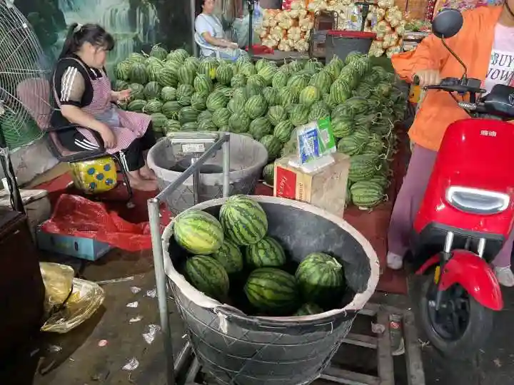 这里还有专营柚子的、西瓜的,你见过这种的专门称西瓜的筐吗?偷偷告诉你,我还摸了一下,是类似胶皮的弹性材料做的,免得西瓜碰裂了。