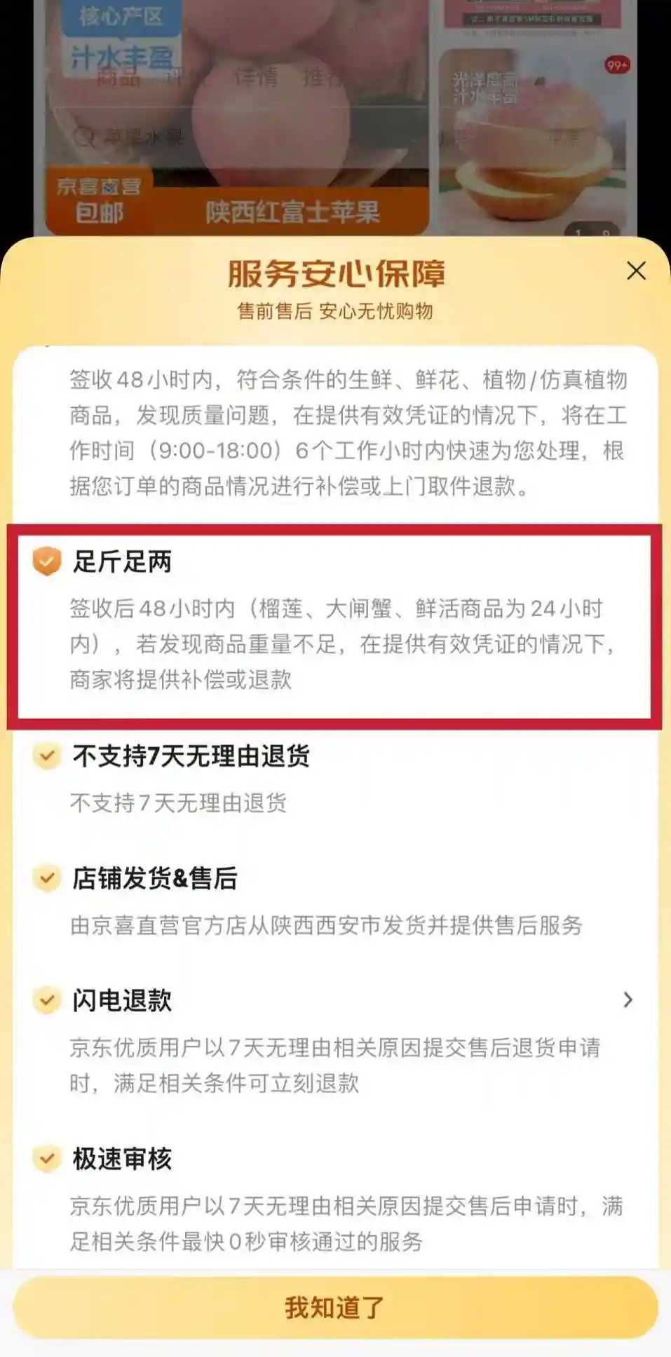 值得一提的是,京喜直营还提供“足斤足两”保障。消费者购买榴莲、大闸蟹、鲜活商品,签收后24小时内,或其他商品签收后48小时内,若发现商品重量不足,在提供有效凭证的基础上,商家将提供补偿或退款。“足斤足两”特色服务,无疑给消费者吃下一颗定心丸。