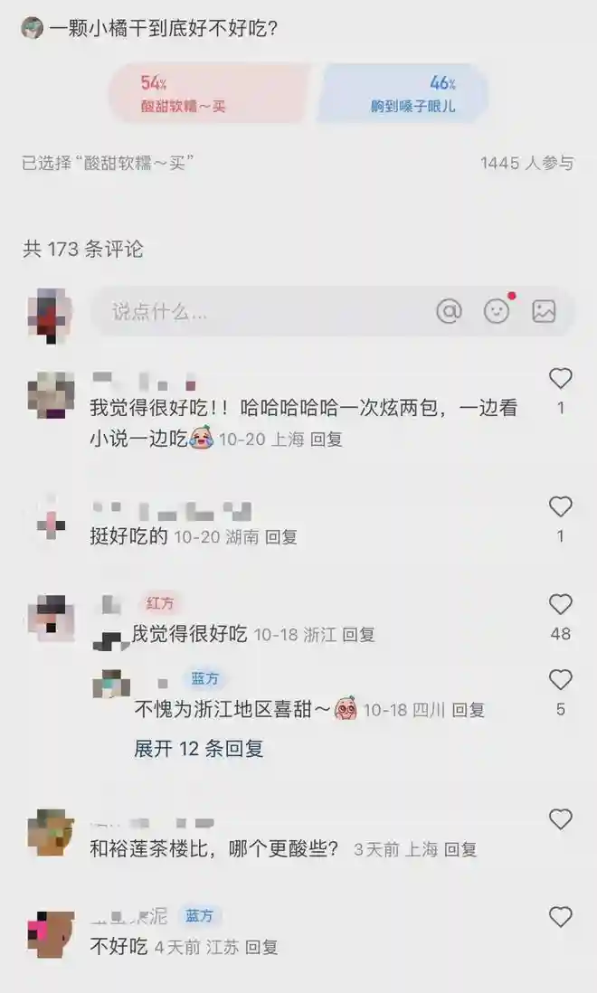 有网友在贴文中发起了关于“一颗小橘干到底好不好吃?”的投票,两方阵营分别是“酸甜软糯~买”和“齁到嗓子眼”,有1445多人参与,而两方阵营比例不相上下,有54%的人选择了“酸甜软糯~买”。