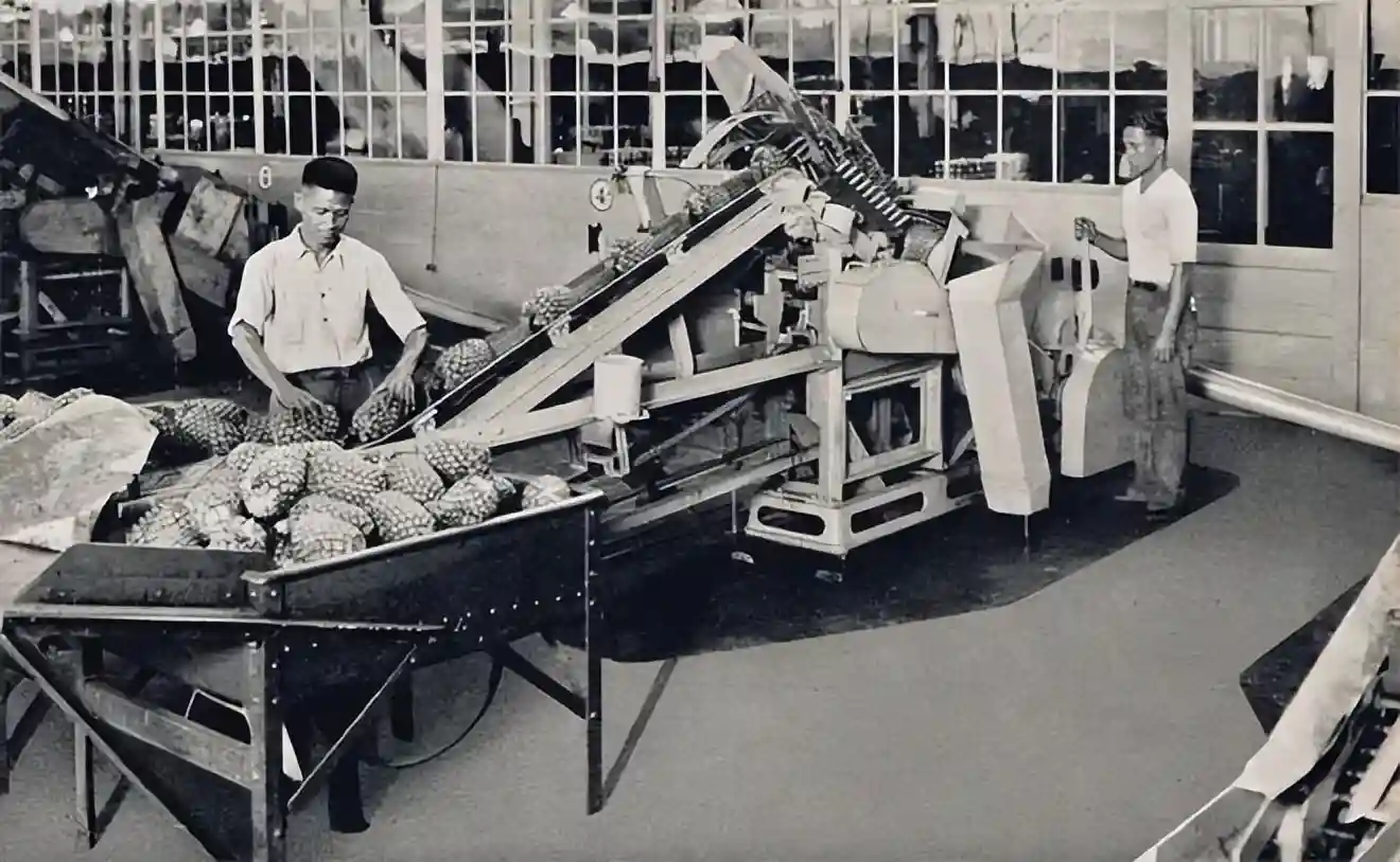 20世纪初,美国已经开始出现了将新鲜菠萝加工成菠萝罐头的情况,但彼时,需要将菠萝去芯,切片装罐,这一套流程需要多人人工干预,效率十分低下。