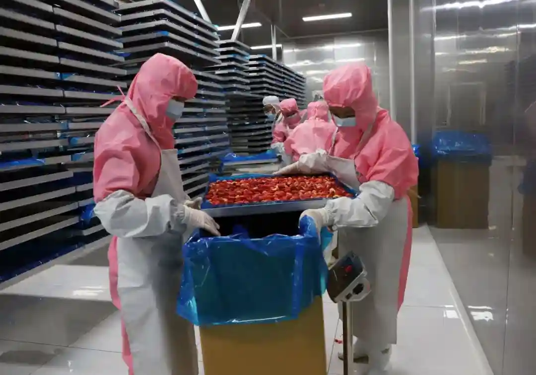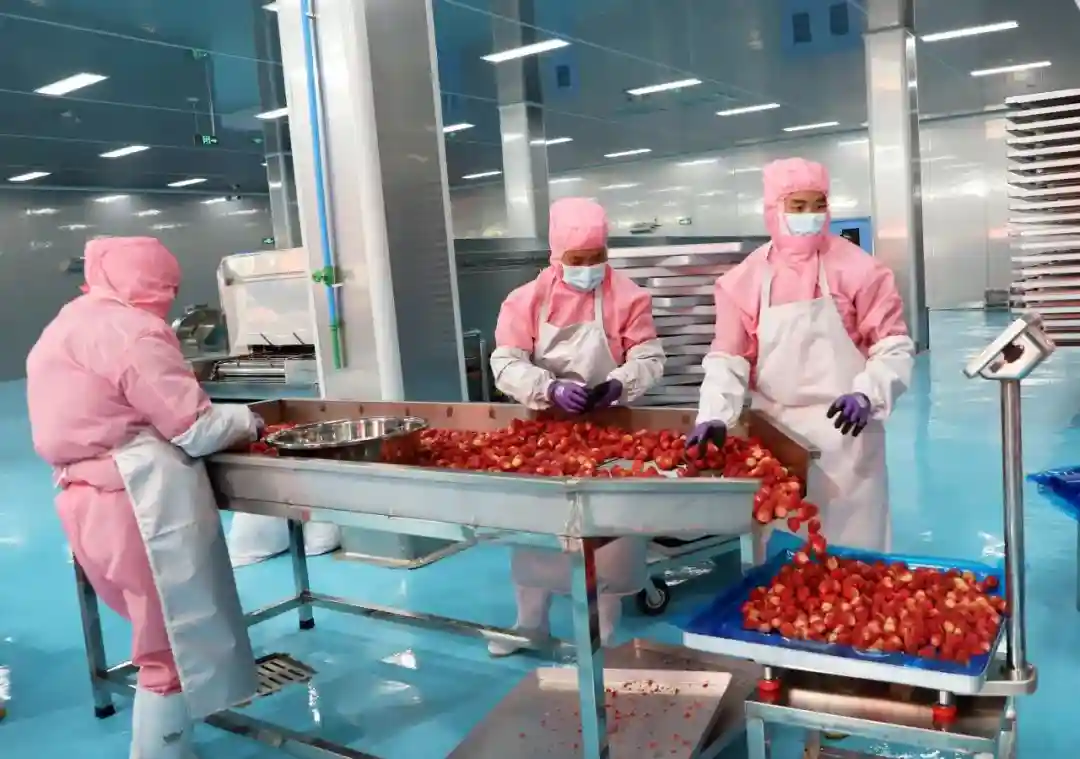 12月15日是草莓深加工项目投产首日。在草莓深加工项目加工车间,先进的FD冻干技术正在这里大显身手,一颗颗鲜红的草莓在-40℃的低温中迅速冷冻,再经过真空干燥,脱去90%以上的水分,变成了疏松干脆、保留原果鲜味的冻干草莓。负责工厂运营的上海万瑞兴食品科技有限公司负责人表示,这些冻干草莓不仅将在国内市场上市,还将远销至美国、德国等13个海外市场。