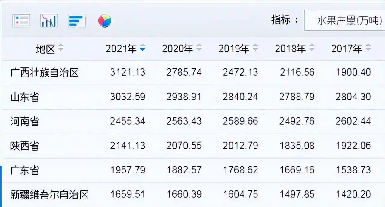 但实际上,广西的水果产量仅仅是在2021年才“发愤图强”排上了第一名。