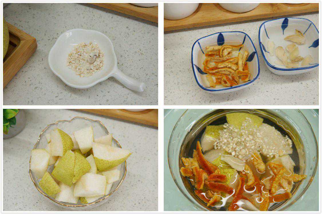 四、陈皮川贝炖梨羹所需食材:川贝2克、陈皮5克、百合、梨1个。