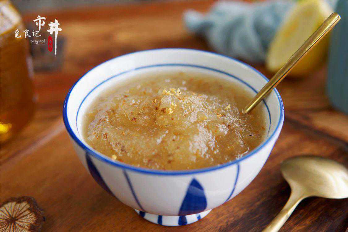 4、开大火熬煮,大火滚开后,撇去浮沫,转小火慢熬,用勺子不停地画圈搅拌,以防粘锅,中途不要加水,加水会缩短雪梨桂花酱的存放时间,熬至黏稠,放入适量干桂花,搅拌均匀,即可盛出装装入容器了,放置一晚即可冲水饮用。