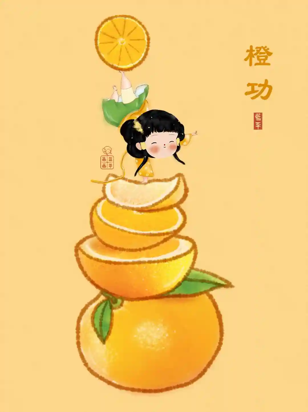 关于成功的定义和标准,越来越多元。人生观、价值观、世界观不同的人会有不同的答案。但也需要不断地积累,才有可能按照自己喜欢的姿态生活,就像画里的女孩,底下堆叠的是橙子不同的形态,掌握好各方面的平衡,才可能摆出一个漂亮的姿态。寓意“橙功”不易,但很美丽。