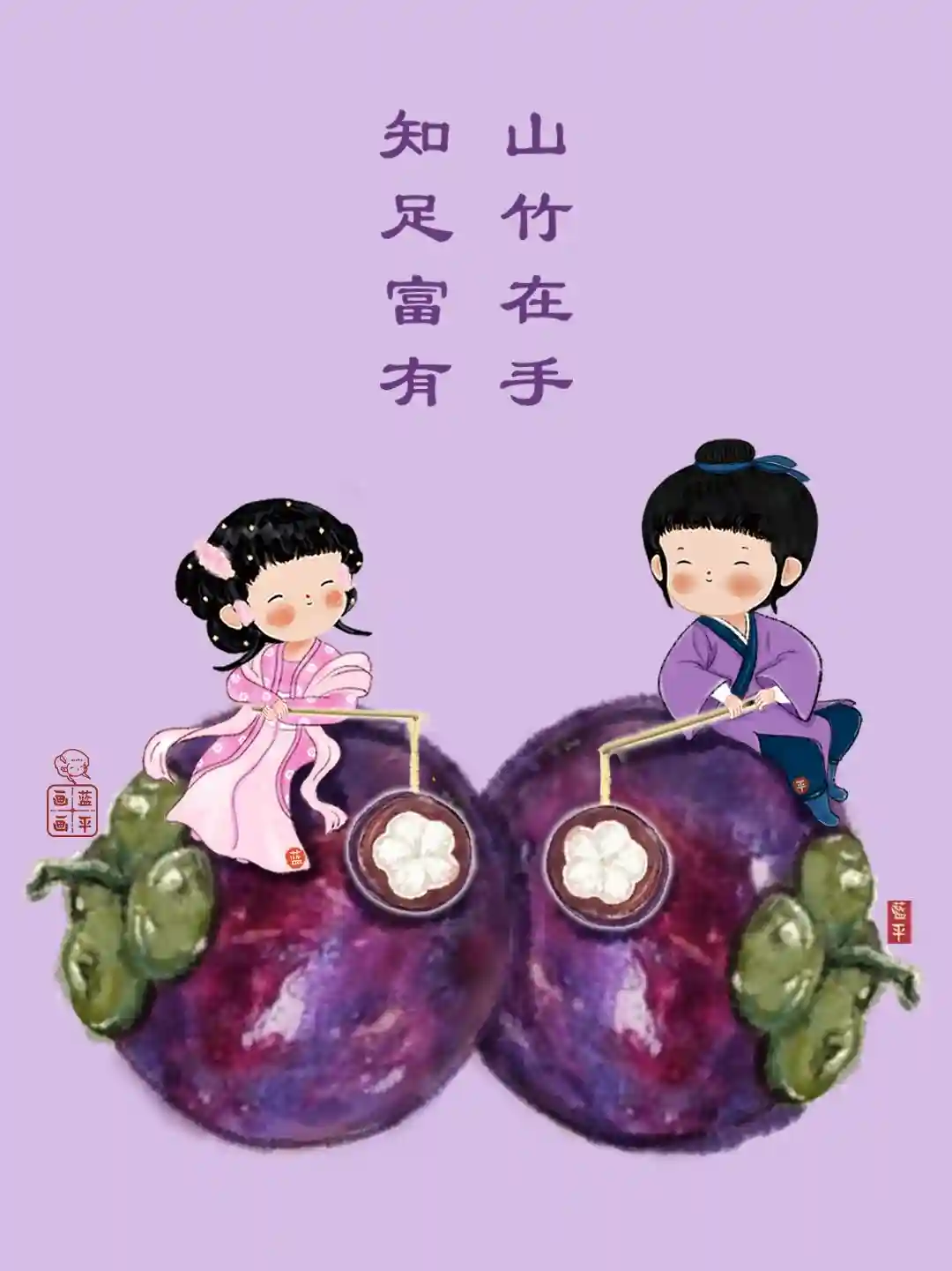 山竹培育周期较慢,有“果中皇后”的美誉。画两个大山竹,人物坐上面温暖微笑,象征知足珍贵。