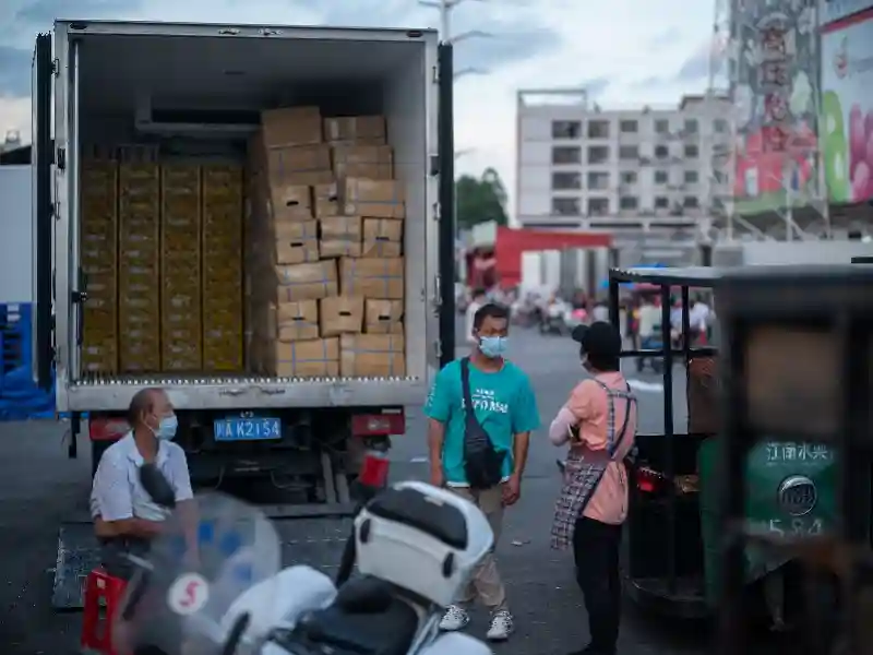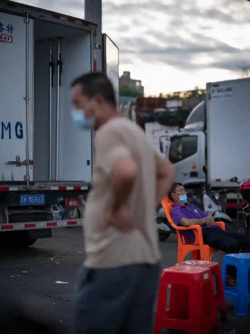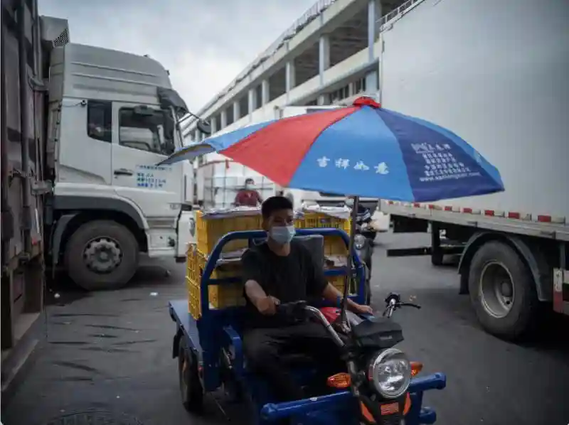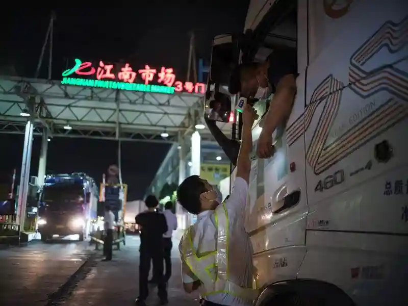 一位司机低下头以便市场工作人员测温。疫情期间,所有进出市场人员必须出示健康码“绿码”及测量体温。一些进货车载重量车长超过20米,载重可达20吨。