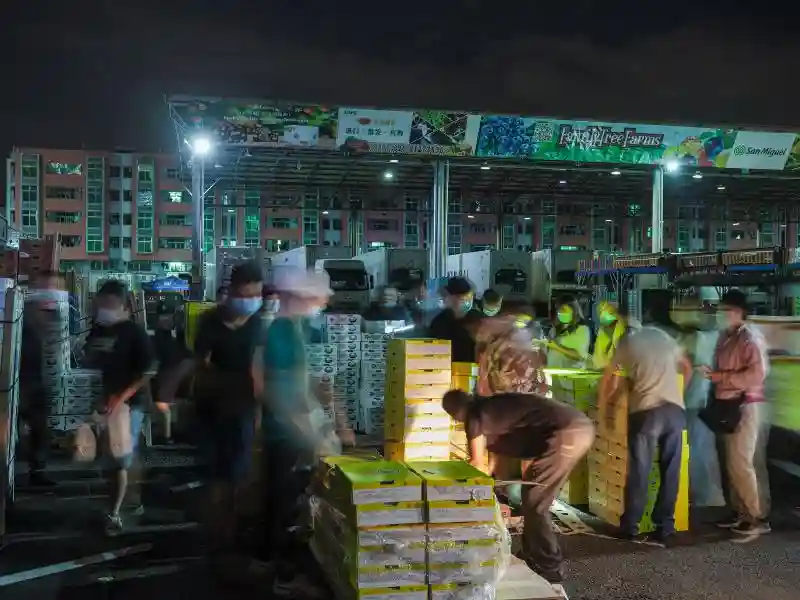 凌晨五点的江南市场进口水果交易区,商户正在搬运水果。全国50%左右的进口水果都经江南市场转运。