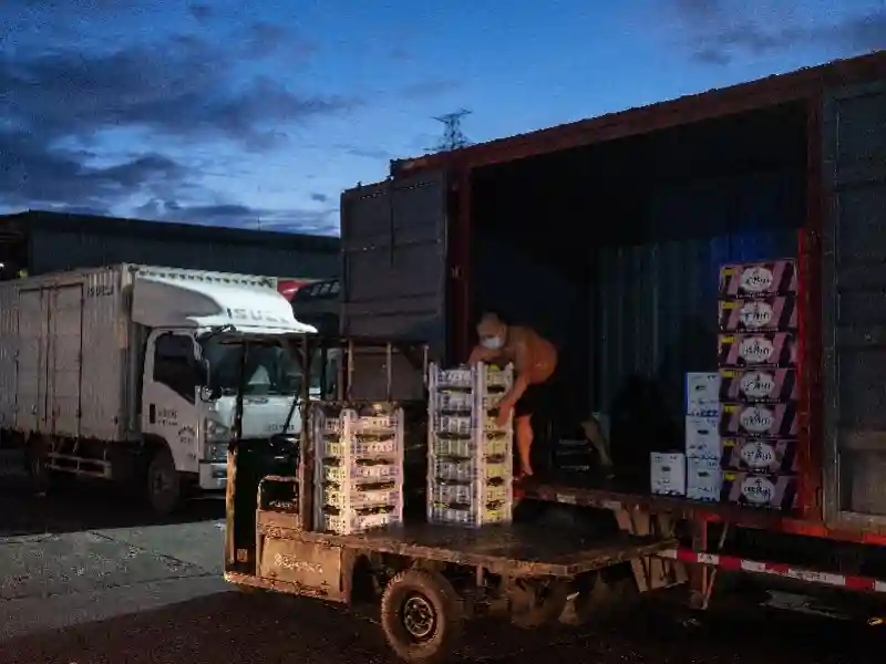 水果采购商在冷藏车停靠的区域外等候。集装箱拖车从南沙港等港口运来的进口水果,首先会在江南市场对面的特设场地进行消杀,拖车和司机返回,市场另派牵引车将水果运至专门的进口水果交易区进行交易。交易达成后,采购商会将水果从集装箱内取出并放上冷藏车,运往全国各地及东南亚市场。