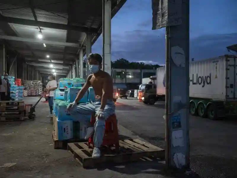 水果经销商正在休息。在江南市场,果菜流转速度很快,通常不超过半天。一名经销云南产金印葡萄的商户告诉记者,疫情发生后,因外地来的水果变少,本地的需求不减,通常凌晨五六点货已卖完。