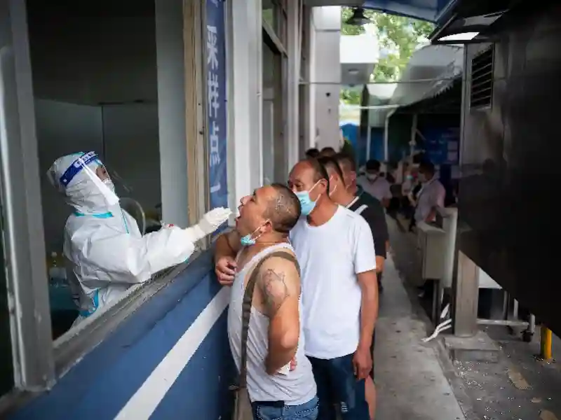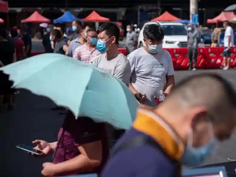 外省货车司机排队进行核酸采样。离穗需出示核酸检测阴性证明的政策施行后,卫健、公安等部门联合松洲街踩点勘察,与经营方协调,半天时间在江南市场内设置了外省货运司机核酸检测点,24小时内可出报告。核酸检测点派驻6—10名医护及工作人员,每日检测约1000人次,已累计检测一万人次以上。