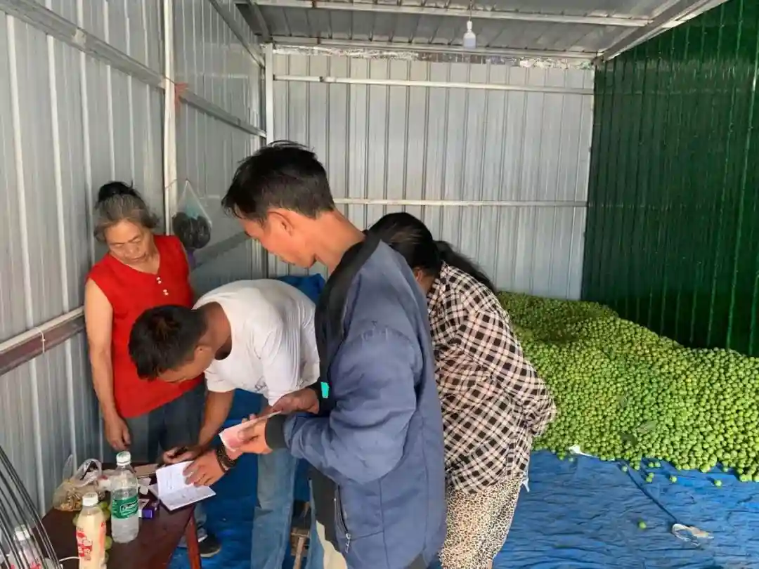 收购商忙完收购,工人们便开始分类、包装,第一时间将水果运送到目的地销售。